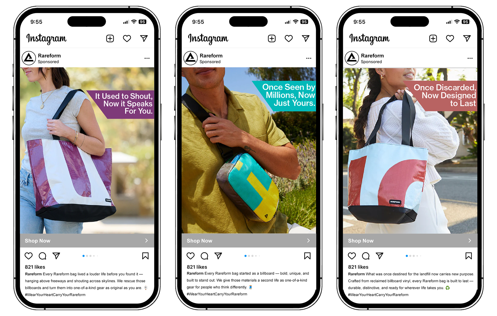 Rareform is a sustainable accessories brand that transforms discarded U.S. billboards into one of a kind bags and gear. Founded by brothers Alec and Aric Avedissian, the company diverts thousands of pounds of vinyl from landfills each month, turning waste into bold, functional designs. While consumers recognize Rareform as environmentally friendly, this campaign aims to elevate the brand beyond sustainability alone by positioning it as the leader in recycled accessories that combine individuality, durability, and design.