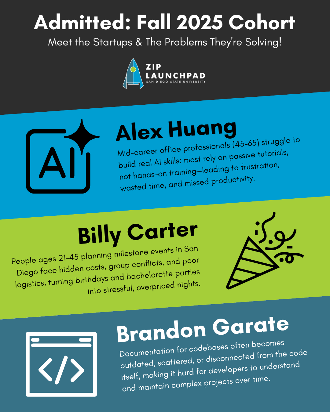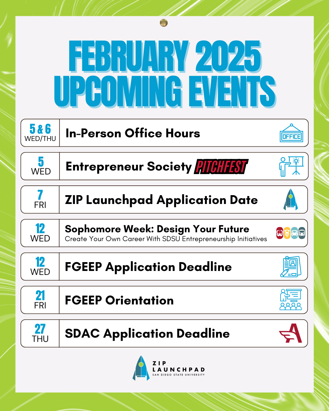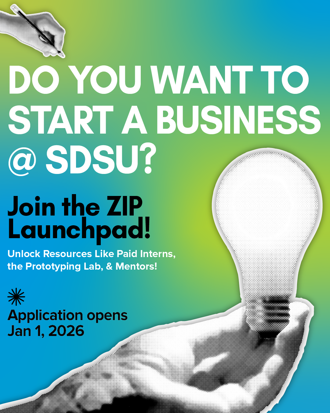 ZIP Launchpad is San Diego State University’s startup incubator, helping students turn innovative ideas into real, scalable businesses. As the Marketing and Graphic Design Intern, I support brand storytelling, social media strategy, content creation, and campaign development to increase applications and drive engagement across programs and events.