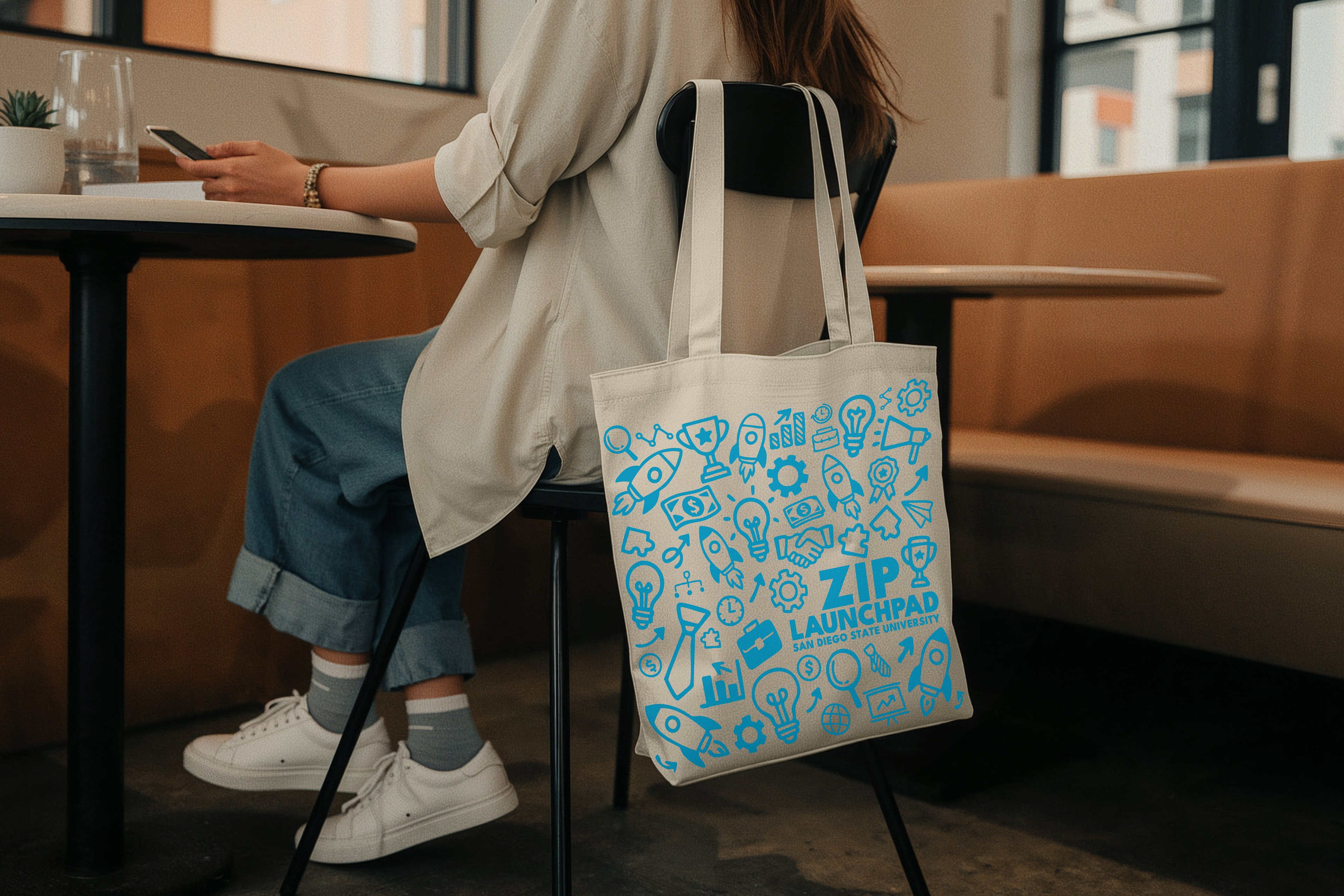 I designed branded merchandise and promotional items that extend ZIP Launchpad’s visual identity into physical products students actually use. This includes tote bags, stickers, and scannable promo pieces that double as awareness tools and engagement drivers.